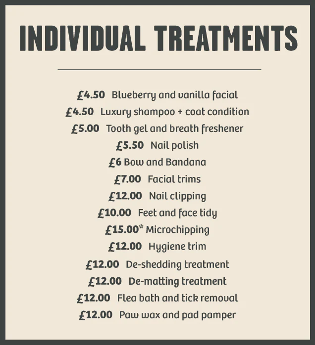 *Please note all prices depend on dog and cat size, coat type and coat condition. Selected stores also offer microchipping services for dogs and cats- please speak to your local salon directly for more information.