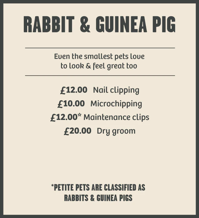 *Please note all prices depend on dog and cat size, coat type and coat condition. Selected stores also offer microchipping services for dogs and cats- please speak to your local salon directly for more information.