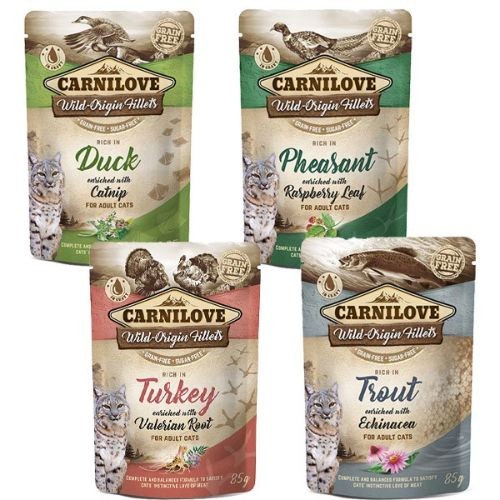 85% meat in fillets (71% chicken, 14% pheasant), 12% broth,1% raspberry leaves, 1% linseed oil, 0.5% minerals, 0.5% vegetable starch.