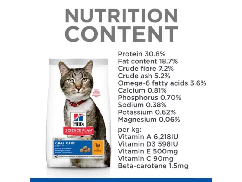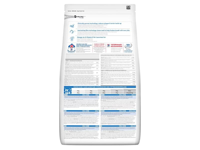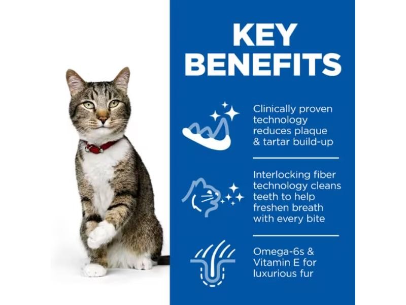 Hill's Science  Plan Oral Care dry cat food provides clinically proven technology to reduce plaque & tartar build-up.Clinically proven technology reduces plaque & tartar build-upInterlocking fiber technology cleans teeth to help freshen breath with every biteOmega-6s  & Vitamin E for luxurious fur