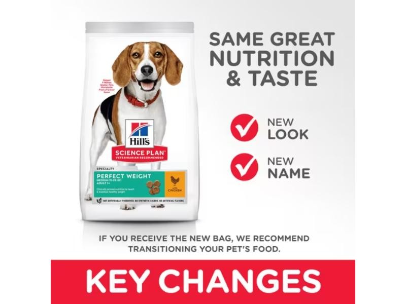 Hill's Science Plan Perfect Weight Medium Adult dog food with Chicken provides delicious, clinically proven nutrition to reach & maintain healthy weight. Our high protein, high fibre formula enriched with L-carnitine & coconut oil helps support pets' metabolism.Key Benefits