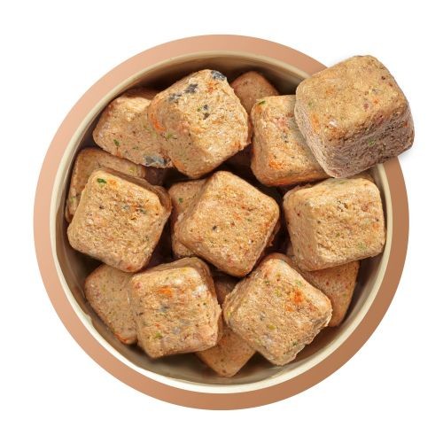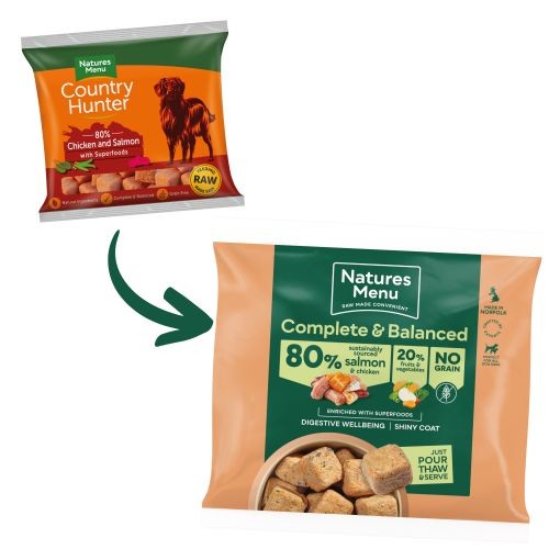 Why opt for chicken or salmon when there’s the option of both! Our raw chicken salmon dog food is the perfect combination. Our Natures Menu Complete & Balanced 80/20 dog food in raw nugget form is an ideal choice for those looking to make the switch to raw. The format is so convenient, all you have to do is pour out the number of nuggets required, thaw and serve to your dog. Chicken is always a popular choice, and salmon is a great natural source of omega fatty acids that’s simply delicious. Our chicken salmon dog food is blended with an enticing mix of wholesome and nutritiousfruits and  vegetables.