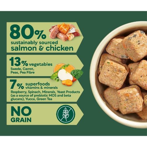 Chicken* 50%, Salmon* 30%, Raspberry* 4%, Swede* 4%, Carrot* 4%, Peas* 3%, Spinach* 1%, Pea fibre*, Minerals, Yeat Products (as a source of prebiotic MOS and beta glucans)* 0.016%, Yucca*, Green Tea*