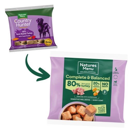 Our farm reared turkey dog food is a great single protein source. Our complete and balanced raw turkey nuggets take dog food to the next level. Worry-free natural feeding, with mess free meal times, due to our innovative nuggets format. All you need to do is pour the number of nuggets you need, let them thaw, then serve. Your dog will love tucking into their delicious food, with high-quality ingredients that you can see, understand and trust. With Natures Menu Complete & Balanced 80/20, you can rest easy, knowing that our turkey dog food nuggets are crafted by experts at our home in Norfolk to FEDIAF guidelines.