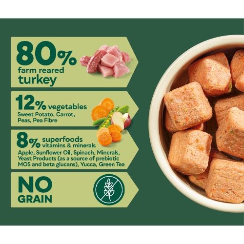 Turkey* 80%, Sweet Potato* 4%, Apple*4%, Carrot* 4%, Peas* 2%, Spinach* 1%, Pea fibre*, Sunflower Oil, Yeast Products (as a source of prebiotic MOS and beta glucans)* 0.016%, Yucca*, Green Tea*