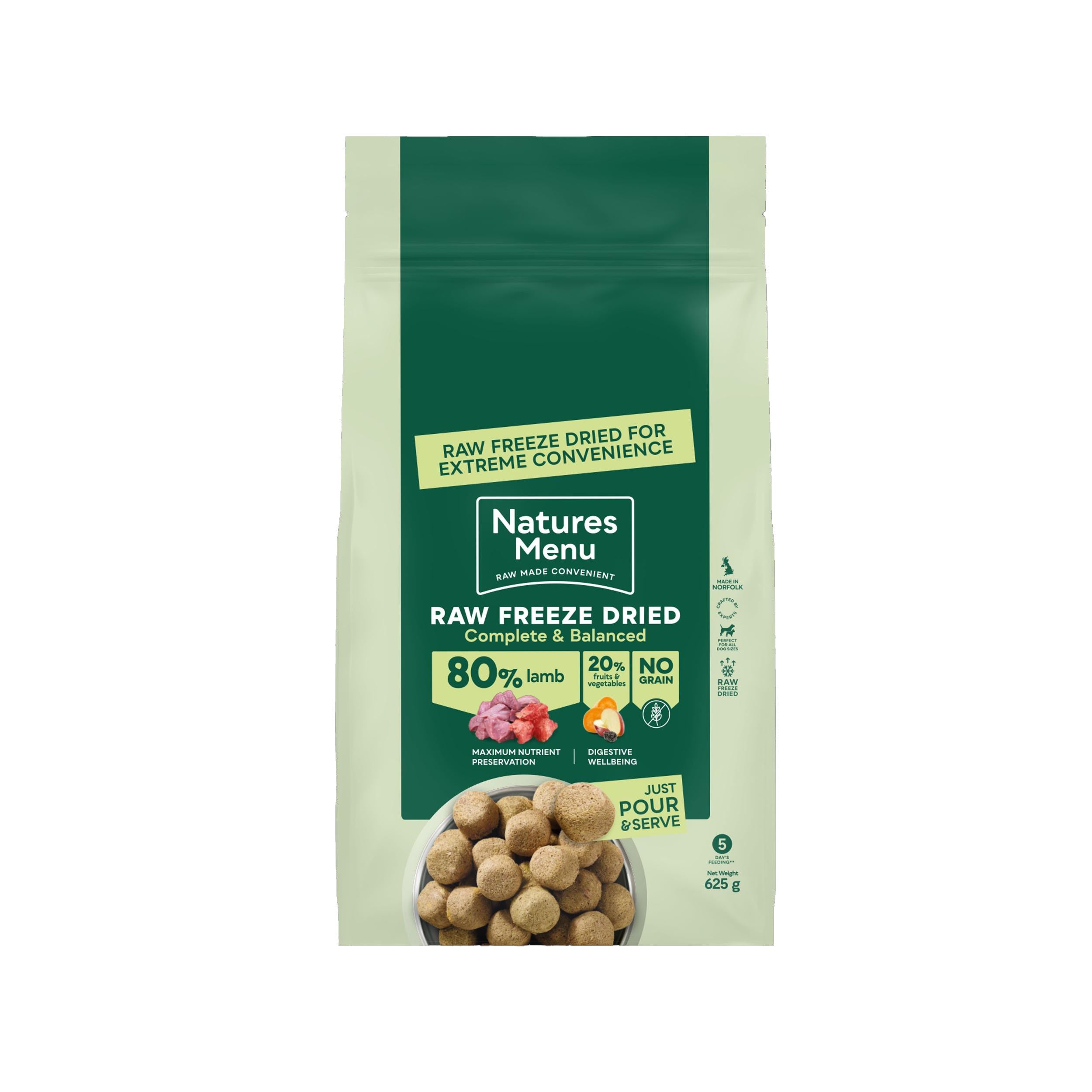 Natures Menu complete and balanced 80:20 Freeze Dried Lamb dog food. The ideal solution to on the go  feeding when raw isn’t practical. Ensuring your dog still gets the same taste and quality of raw in a Freeze Dried alternative. Its raw without the thaw!