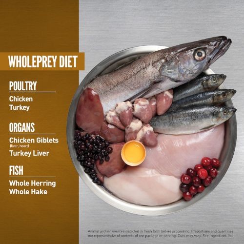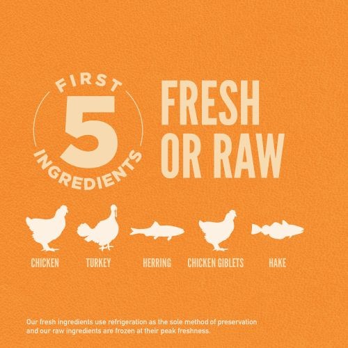 Fresh chicken meat (18%), fresh turkey meat (7%), fresh whole eggs (5%), fresh chicken liver (5%), fresh whole flounder (4%), fresh whole herring (4%), fresh turkey liver (4%), fresh chicken heart (4%), fresh turkey heart (4%), fresh chicken necks (4%), chicken (dehydrated, 4%), turkey (dehydrated, 4%), whole mackerel (dehydrated, 4%), whole sardine (dehydrated, 4%), whole herring (dehydrated, 4%), chicken fat (3%), whole red lentils, whole green peas, whole green lentils, whole chickpeas, whole yellow peas, lentil fiber, whole pinto beans, whole navy beans, chicken cartilage (dehydrated, 1%), herring oil (1%), chicken liver (freeze-dried), turkey liver (freeze-dried), fresh whole pumpkin, fresh whole butternut squash, fresh whole zucchini, fresh whole parsnips, fresh carrots, fresh whole red delicious apples, fresh whole bartlett pears, fresh kale, fresh spinach, fresh beet greens, fresh turnip greens, brown kelp, whole cranberries, whole blueberries, whole saskatoon berries, chicory root, turmeric root, milk thistle, burdock root, lavender, marshmallow root, rosehips, enterococcus faecium. ADDITIVES (per kg): Nutritional additives: Zinc chelate: 100 mg; Copper chelate: 11 mg; Choline chloride: 1200 mg.