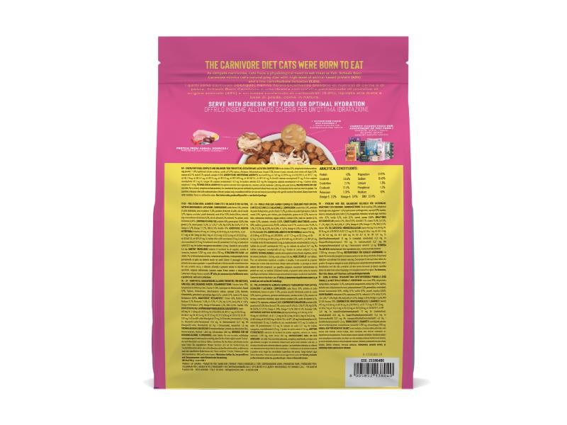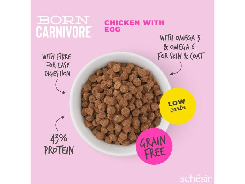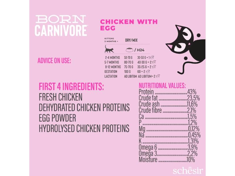 CHICKEN WITH EGG. COMPLETE AND BALANCED FOOD FOR KITTENS, GESTATION AND LACTATION. COMPOSITION: fresh chicken 33%, dehydrated chicken proteins,