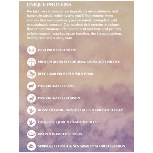 Bison (12%), Lamb Meal, Chicken Meal, Sweet Potatoes, Peas, Potatoes, Canola Oil, Egg Product, Beef, Roasted Venison (4%), Tomato Pomace, Potato Protein, Ocean Fish Meal, Minerals, Dried Chicory Root, Tomatoes, Blueberries, Raspberries, Yucca Schidigera Extract