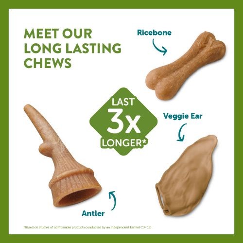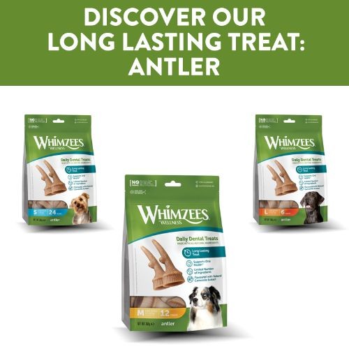 Whimzees® by Wellness long lasting treats are specifically designed to keep your dog busy. The unique antler shape was crafted to give your dog a healthy challenge that helps keep them engaged and chewing longer. The longer the chew, the happier your dog is!